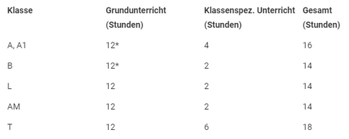 *die Angabe bezieht sich auf den Ersterwerb; bei Erweiterung reduziert sich der Grundunterricht auf 6 Stunden.